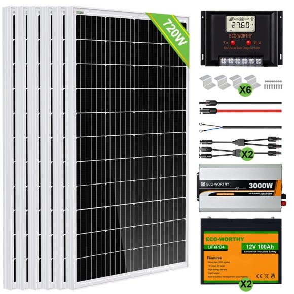 ECO-WORTHY 720 Wp 24V Off-Grid Komplettset Solaranlage k?nnen f¨¹r verschiedene Zwecke verwendet werden. Darunter H¨¹tten, Garten und Wohnmobile. Unabh?ngig davon, wof¨¹r das Kit verwendet wird, k?nnen Sie sicher sein, dass Sie ein Qualit?tssystem erwerben. Die Solarmodule der ECO-WORTHY 120Wp sind hochwertige Module mit monokristallinen Zellen, Hervorragendes Schwachlichtverhalten an bew?lkten Tagen, morgens und abends. Solarmodul besteht aus hagelfestem, geh?rtetes Solarglas mit einer wetterfesten Beschichtung, der Rahmen aus eloxierten Aluminium und die Anschl¨¹sse sind wetterbest?ndig - demnach also optimal gesch¨¹tzt gegen WInd und Wetter. 25 Jahren Leistungsgarantie. Der 60A PWM-Laderegler ist geeignet f¨¹r geschlossene Bleiakkus, Gel-Akkus, S?ureakkus und Lithiumakkus, Hohe betriebssicherheit. ECO-WORTHY 3000W 24V-220V hochwertige Reiner Sinus-Wechselrichter wandelt den Gleichstrom in Wechselstrom f¨¹r ihre Haushaltsger?te um. Die Stromqualit?t entspricht dem des gewohnten Haushaltsstromes. Sie k?nnen damit problemlos Stereoanlagen, Kaffeemaschinen, Laptops, Netzteile, K¨¹hlboxen Beleuchtung oder Fernseher betreiben.