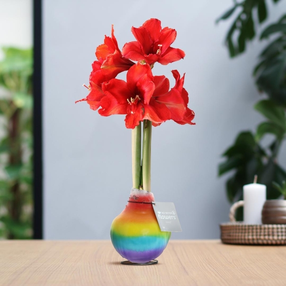 Amaryllis No Water rote Blume mit Regenbogen Topf Design - Pflegeleichte Blühende Zimmerpflanze Bunt Rainbow Design Flower