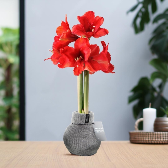 Amaryllis No Water rote Blumen Kuschel Look Sweater Strick - Pflegeleichte Blühende Zimmerpflanze in 3 Farben Grau Weiß Rosa