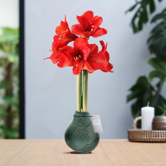 Produktbeschreibung: Entdecken Sie die innovative No Water Blume Amaryllis im edlen Marmor Design – eine einzigartige, pflegeleichte Zimmerpflanze, die ganz ohne Wasser blüht. Diese gewachste Amaryllis-Zwiebel mit marmoriertem Effekt bringt prachtvolle rote Blüten und zeitlose Eleganz in Ihr Zuhause.. Produkthighlights:. Blüht garantiert ohne Wasserzugabe. Edles Marmor-Design in 3 Farbvarianten (Bordeaux, Dunkelgrün, Schwarz). Pflegeleichte Zimmerpflanze, ideal für elegante Einrichtungen. Blüht innerhalb von 3-5 Wochen mit prächtigen roten Blüten. Kompakte Blütenstiele mit stabiler Wuchsform. Mamorierter Effekt für luxuriösen Look. Ideal für: Pflanzenliebhaber und Design-Enthusiasten, die eine mühelose, blühende Zimmerpflanze mit edler Ausstrahlung suchen. Perfekt für elegante Wohnräume oder als besonderes Geschenk.. Im Lieferumfang enthalten:. 1x Amaryllis No Water Blume Zwiebel. 1x Marmorierter Überzug in Wunschfarbe. 1x Metallstütze für optimale Stabilität. 1x Dekorative Geschenkverpackung. Woher kommt die Amaryllis No Water Blume? Die Amaryllis stammt ursprünglich aus Südamerika. Diese innovative No Water Variante wurde seit 2012 in den Niederlanden entwickelt und perfektioniert.. Wie pflegt man eine Amaryllis No Water Blume? Die Pflege ist denkbar einfach: Stellen Sie die Wachsblume an einen hellen Ort ohne direkte Sonneneinstrahlung bei Raumtemperatur. Kein Gießen oder Düngen notwendig.. Wie viel Wasser braucht eine Amaryllis No Water Blume? Diese besondere Zimmerpflanze benötigt kein Wasser. Die gewachste Zwiebel enthält alle nötigen Nährstoffe für die Blüte.. Welche Erde braucht die Amaryllis No Water Blume? No Water Blumen benötigen keine Erde und kein Umtopfen. Die Zwiebel ist bereits perfekt in Wachs eingebettet.. Wie düngt man eine Amaryllis No Water Blume? Ein Düngen ist nicht erforderlich. Die Zwiebel enthält alle notwendigen Nährstoffe für eine prachtvolle Blüte.. Welche Schädlinge befallen Amaryllis No Water Blume? Dank der Wachsschicht sind No Water Blumen optimal vor Schädlingen geschützt.. Ist die Amaryllis No Water Blume giftig? Amaryllis-Zwiebeln sind giftig für Haustiere. Bitte außerhalb der Reichweite von Tieren aufstellen.. Hinweis: Das gelieferte Produkt kann in Wuchsform und Marmorierung leicht von den Abbildungen abweichen, da es sich um ein Naturprodukt handelt.