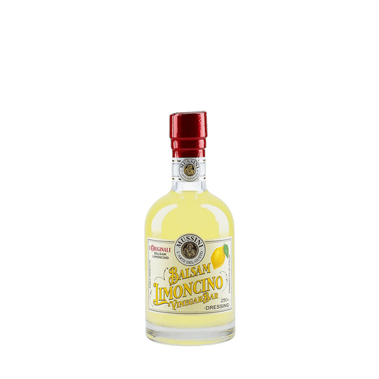 Balsamico-Dressing aus weißem, gekochtem Traubenmost und Weinessig, aromatisiert mit Zitronenschalen und Limoncino. Mit seiner sattgelben Farbe und dem intensiven Nachgeschmack nach Zitronen kann dieser Limoncino-Essig mit subtiler Säure von 4 % für Mixgetränke und besondere Cocktails als auch zum Verfeinern verschiedener Gerichte eingesetzt werden - besonders zu Fisch wie einem Lachs-Carpaccio besonders gut.