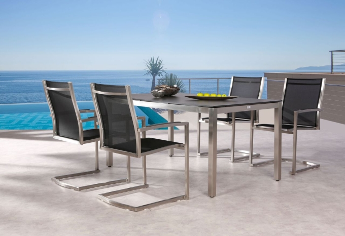 5-tlg. Tischgruppe Marbella, bestehend aus: 4x Freischwingsessel + 1x Tisch. Gestelle und Gelenkteile bestehen aus elegantem Edelstahl, Qualität V 304, dadurch besonders stabil und langlebig, rostfrei, witterungsbeständig und leicht zu reinigen. Die Bespannung der Sessel besteht aus strapazierfähigem und wetterfestem Ergotex, das hautfreundlich und atmungsaktiv ist. Die Ergotex-Bespannung ist auswechselbar. Bei Platzbedarf lässt sich der Sessel platzsparend stapeln. Durch die sehr stabile Beinkonstruktion aus elegantem Edelstahl, Qualität V 304 bietet der Tisch Marbella ein interessantes und modernes Design. Die bruchsichere HPL-Schichtstoffplatte (12 mm) mit marmoriertem Dekor Ardesia ist äußerst robust und kratzfest. Eine sehr stabile Beinkonstruktion aus Edelstahl bewirkt hervorragende Standfestigkeit. Witterungs- und UV-beständig. Maße Sessel: Gesamtmaß: BxTxH in cm: 57x64x93 / Sitzfläche BxT in cm: 45x47 / Sitzhöhe: 45 cm/ Höhe der Armlehne: 64,5 cm / Höhe der Rückenlehne: 52 cm; Maße Tisch: rechteckig 160 x 90 cm / Tischhöhe: 76 cm
