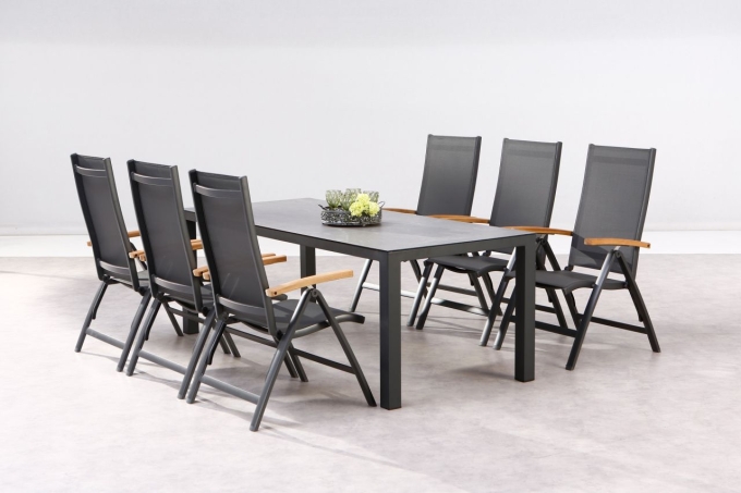 7-tlg. Dining Gruppe Cavalese+Houston anthrazit/Teak, bestehend aus: 6x Klappsessel + 1x Tisch. Der komfortable Gestellrahmen und die Gelenkteile des Klappsessels sind komplett aus Aluminium somit absolut korrosions- und witterungsfest und leicht im Handling. Das Gestell ist pulverbeschichtet. Ergonomisch geformte Sitz und Rückenlehne mit atmungsaktiver Bespannung aus reißfestem Ergotex-Gewebe. Bequeme, breite Armlehnen aus edlem, witterungsbeständigem Teak-Holz. Die Rückenlehne ist mehrfach verstellbar. Neuentwickelte Tischoberfläche aus einem Glasträger mit gebrannter Keramikoberfläche, daher absolut kratzfest und bruchsicher. Die 10 mm starke Tischplatte hat eine dezent strukturierte Marmoroptik. Das stark dimensionierte Tischgestell besteht aus hochwertigem Aluminium. Die Tischbeine sind mit Höhen-Ausgleichsschrauben ausgestattet, somit steht der Tisch auf unebenem Boden sehr stabil. Maße Sessel: Gesamtmaß: BxTxH in cm: 62x67x110 / Sitzfläche BxT in cm: 48x45 / Sitzhöhe: 43 cm/ Höhe der Armlehne: 66,5 cm / Höhe der Rückenlehne: 72 cm; Maße Tisch: rechteckig 210 x 90 cm / Tischhöhe: 74,5 cm