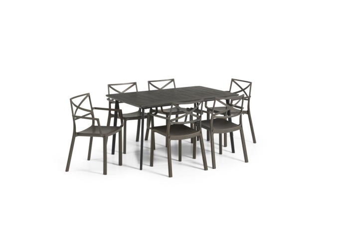 7-tlg. Dining Gruppe Torino, bestehend aus: 6x Sessel + 1x Tisch. Stapelsessel in Gusseisen-Optik, hergestellt aus hochwertigem Kunststoff, daher UV- und wetterbeständig. Platzsparend stapelbar. Moderner Tisch in Gusseisen-Optik. Tischplatte hergestellt aus hochwertigem, UV- und wetterbeständigem Kunststoff, zusätzlich mit Metallstreben verstärkt. Das rostfreie Stahlgestell ist mittels einer speziellen Ausrüstung witterungsbeständig und sehr standfest. Maße Sessel: Gesamtmaß BxTxH in cm: 58x53x83 / Sitzfläche BxT in cm: 41x42 / Sitzhöhe: 46 cm/ Höhe der Armlehne: 65 cm / Höhe der Rückenlehne: 40 cm; Maße Tisch: Gesamtmaß BxTxH in cm: 146x87x75 / Tischhöhe: 75 cm