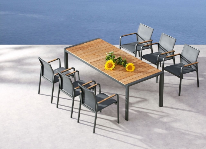 7-tlg. Tischgruppe Paros anthrazit, bestehend aus: 6x Stapelsessel + 1x Tisch. Moderne Dining-Gruppe mit einem Gestell aus rostfreiem Aluminium. Daher leicht und unkompliziert im Handling mit einer strapazierfähigen Oberflächenbespannung aus witterungsbeständigem Ergotex. Der ergonomische Knick der Rückenlehne ergibt ein sehr bequemes Sitzgefühl. Die Sessel sind platzsparend stapelbar und hervorragend für den Objektbereich geeignet. Die Armlehnenaufsätze und die Tischleisten sind aus hochwertigem, angenehmem Teakholz angefertigt. Maße Sessel: Gesamtmaß BxTxH in cm: 56x64x85 / Sitzhöhe: 45 cm / Sitzfläche: 44x50 cm / Höhe der Armlehne: 65 cm / Höhe der Rückenlehne: 43 cm / Maße Tisch: rechteckig 210 x 90 cm / Tischhöhe: 76 cm