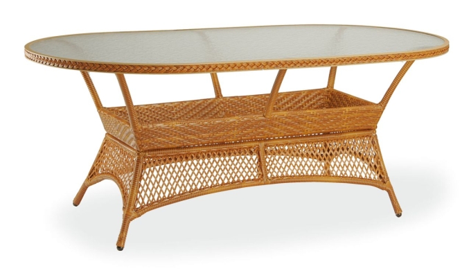 Ein eleganter Korbtisch mit einem Kunstfadengeflecht sowie einem stabilem Aluminiumgestell. Im Gegensatz zum Naturmaterial ist dieser Korbtisch gegen alle Witterungseinflüsse beständig und pflegeleicht. Der Tisch besitzt eine praktische Zwischenablage sowie eine bruchsichere Glasplatte. Die unterschiedlichen Flechtarten betonen die Lebendigkeit des Designs. Ein ansprechender Korbtisch der nicht nur für draußen auf Grund seiner wetter- und U.V.-Beständigkeit sondern auch für den Wintergarten oder den Wohnbereich bestens geeignet ist. Je nach Platzbedarf ist der Tisch auch zerlegbar. Maße: oval 180 x 100 cm / Tischhöhe: 73 cm