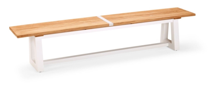 Massive Bankgruppe, getragen von einem formstarken, schweren Aluminiumgestell in klarem weiß oder anthrazit. Die massiven Holzplanken der Tisch- und Sitzflächen sind aus erlesenem Recycle-Teakholz, die Tischplanken sind auf 40 mm aufgedoppelt. Die Serie ist als Bankgruppe oder auch in Kombination mit anderen Sesselformen individuell kombinierbar. Maße: 220 x 40 cm / Sitzhöhe: 45 cm