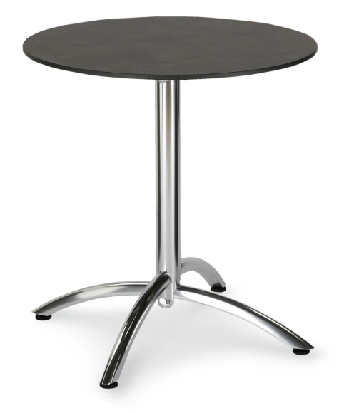Die robusten, bruchsicheren 12 mm starken HPL-Schichtstoff-Tischplatten in drei Dekoren sind pflegeleicht, kratzfest und praktisch unverwüstlich. Hochwertiges, hochglanzpoliertes Aluminiumgestell, leicht, rostfrei und platzsparend in sich stapelbar. Handlicher, einfacher Klappmechanismus mit Sicherheits-Arretierung. Mit Niveau-Ausgleichsschrauben sind alle Unebenheiten am Boden auszugleichen. Mit einer praktischen Sicherheitsöse können die Tische durch ein Drahtseil verbunden und vor Diebstahl gesichert werden. Ideal für den Objektbereich geeignet. Maße: rund 70 cm Ø / Tischhöhe: 73 cm