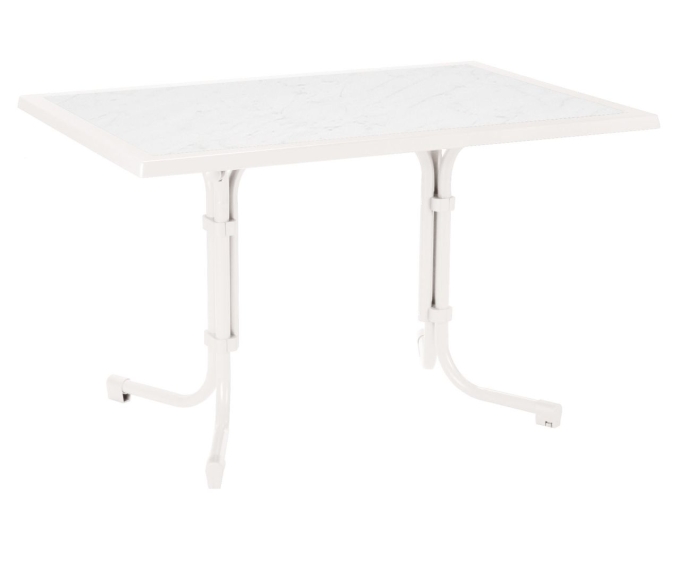 Die extrem strapazierfähige Werzalit-Tischplatte ist absolut wetterfest und pflegeleicht. Sie besitzt eine weiße Oberflächenmarmorierung und hat keine Kanten und Fugen. Die Platte ist kratzfest, hitzebeständig und belastbar. Das stabile und standfeste Stahlrohrgestell mit doppeltem Klappmechanismus und Sicherheitsbügel ist weiß pulverbeschichtet. Mit wenigen Handgriffen wird die Platte abgeklappt und das Fußgestell einfach seitlich eingeschwenkt. Dank der Niveauausgleichsschraube kann die optimale Standfestigkeit auf unebenem Boden eingestellt werden. rechteckig 120 x 80 cm / Tischhöhe: 72 cm