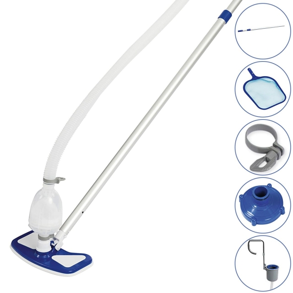Sorgen Sie für ein sauberes Badevergnügen! Das Pool-Reinigungspflegeset von BESTWAY kann für jeden Pool eingesetzt werden. Es sorgt für klares und sauberes Wasser in Ihrem Pool. Das Set beinhaltet: ✔ Vakuum-Bodensauger mit abnehmbarem, wiederverwendbaren Schmutzfang-Behälter zum Anschluss an das Filterpumpensystem ✔ verstellbarer Aluminium Teleskopstil für Kescher und Sauger mit 279 cm Länge. Zur bequemen Reinigung der Poolwände und des Poolbodens ✔ Kescheraufsatz mit robuster Netzbespannung für die manuelle Aufnahme von Fremdkörpern ✔ verschiedene Adapter zum Anschluss an unterschiedliche Filterpumpen-Systeme ✔ 6m Schlauch (3,2 cm Durchmesser) ✔ Oberflächenskimmer aus robustem Kunststoff zur Montage an der Poolwand. Angeschlossen an das Filterpumpensystem wird die Wasseroberflache automatisch gereinigt Einem sauberen Badevergnügen steht so nichts mehr im Weg. Produktvorteile - zur bequemen Reinigung der Wasseroberfläche, der Poolwände, des Poolbodens - Werkzeuge lassen sich einfach und schnell wechseln - für alle Pool-Typen geeignet - sauberes Wasser mit wenig Aufwand Technische Daten: - Skimmer: geeignet für Filterpumpen ab einem Durchsatz von mindestens 3028 Litern pro Stunde - Material Teleskopstange: Aluminium - Material sonstige Teile: Kunststoff - Farbe: blau, weiß Lieferumfang: - 1x Bestway Reinigungsset Deluxe