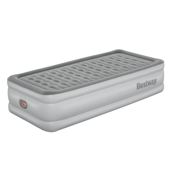 TriTech™ Single-XL-Luftbett mit antimikrobieller Oberfläche & integrierter Elektropumpe 203 x 97 x 46 cm Das Bestway® TriTech™ Single-XL-Luftbett für 1 Person bringt den Traum vom Schlaf auf Wolke sieben ein Stück näher! Die einzigartige Ultra-Fresh® -Beschichtung der Oberfläche verhindert die Entstehung von Bakterien und Schimmel.Durch diese einmalige Behandlung wird die Lebensdauer des aufblasbaren Bettes (203 x 97 x 46 cm) effektiv verlängert. Außerdem ist die samtartige Oberfläche in Dunkelgrau ein absoluter Eyecatcher: Diese fühlt sich extra weich an und hinterlässt ein angenehmes Gefühl auf der Haut. Dank der außergewöhnlichen Höhe von 46 cm wird das Ein- und Aussteigen enorm erleichtert. Somit zeichnet sich die Luftmatratze in Lichtgrau nicht nur durch ergonomische, sondern auch durch rückenschonende Eigenschaften aus. Zudem bietet das Single-XL-Luftbett in Übergröße auch großen Menschen perfekten Komfort auf ganzer Linie. Die stabile Wave-Beam-Innenkonstruktion macht die Reise ins Traumland ausgesprochen einfach: Sie bringt mehr Stabilität, sorgt für eine optimale Gewichtsverteilung und gleicht unterschiedliche Belastungen ideal aus. Zusätzlich setzt das 3-lagige TriTech™ -Material aus Vinyl und Polyester neue Maßstäbe. Dank der hochwertigen Verarbeitung und der robusten Konstruktion hat das Luftbett eine maximale Belastbarkeit von bis zu 150 kg. Mit der integrierten, TÜV-geprüften Elektropumpe ist der Aufbau ein Kinderspiel: In nur 180 Sekunden baut sich das neue Gästebett blitzschnell von selbst auf und ist sofort einsatzbereit. Ein im Drehschalter integriertes Ventil lässt zusätzlich manuelles Auf- und Abpumpen zu. Die besondere Form der Matratze ermöglicht das Verwenden eines Spannbettlakens. Zudem verhindert das Luftrahmendesign ungewolltes Herunterrollen vom Luftbett. Zum Entlassen der Luft in Windeseile kann ebenfalls die Pumpe oder auch das eingebaute Ventil verwendet werden. Das Stromkabel kann platzsparend im eingebauten Kabelfach verstaut werden. Um das aufblasbare Bett richtig zu lagern, muss es nach dem Entleeren lediglich zusammengefaltet werden. Die dazugehörige Tragetasche eignet sich nicht nur zum bequemen Transport, sondern macht auch die ideale Lagerung super leicht. Bei minimalen Rissen oder Schäden hilft der im Set enthaltene, selbstklebende Reparaturflicken: Auf die betroffene Stelle kleben, festdrücken und Gästebett ist direkt wieder startbereit. Aufgrund des schlichten Designs ohne weitere, farbliche Veredelung ist die Verpackung besonders umwelt- und klimaschonend. Mit dem Bestway® TriTech™ Single-XL-Luftbett warten durch das ausgezeichnete Zusammenspiel von Komfort und Langlebigkeit erholsame Nächte auf alle Übernachtungsgäste.