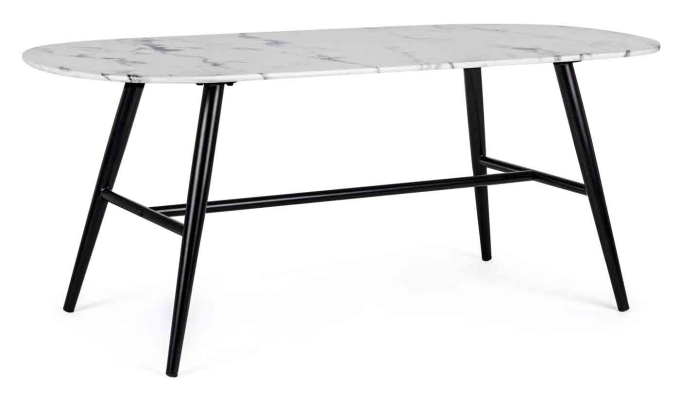 Das Gestell des Couchtisches Marble wurde aus lackiertem Metall gefertigt. Die Tischplatte wurde aus Glas mit einer Dicke von 10 Millimetern gefertigt welche in einer Marmor-Optik ist. Das Design des Tisches ist modern.