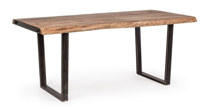 Unser Esstisch Elmer von der Marke Bizzotto ist für Alle die Industrie-Design und Massivholzmöbel lieben. Der massive Esstisch mit der Akazienholz Tischplatte hat eine natürliche Baumkante und vor Kopf zusätzlich Metallbänder diese sind sowohl für die Stabilität des Esstisches aber ebenso unterstreicht dies nochmals den industriellen Charakter des Möbelstücks. Das Metallgestell besteht aus einem 2er Set U-Gestelle die sich nach unten leicht verjüngen eine Art Trapezform dass Metall ist unbehandelt und passt perfekt zum Gesamtbild des Esstisches.