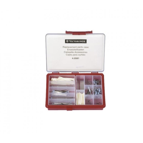 Kiste mit Fächern, die eine Auswahl an Ersatzteilen enthält (Ersatz- und Reparaturzubehör: Pinzetten, Zahnstocher, Mini-Schraubendreher, abgebrochene Ringe, Stifte, Scherenfedern).