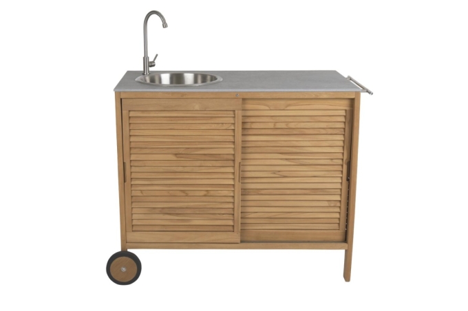 Genießen Sie im Freien ein köstliches Essen zuzubereiten und zu servieren mit der Gartenküche Figalia von Brafab. Diese robuste und stilvolle Küche besteht aus hochwertigem Teakholz und einer Arbeitsplatte aus Terrazzo die beide wetterfest sind. Die Küche verfügt auch über ein praktisches Waschbecken und einen Wasserhahn damit Sie Ihr Geschirr oder Ihre Hände im Handumdrehen reinigen können. Dank der beiden Rollen ist diese Küche leicht zu bewegen und kann an verschiedenen Orten in Ihrem Garten oder auf Ihrer Terrasse platziert werden. Mit einer Breite von 124 cm einer Tiefe von 67 cm und einer Höhe von 93 cm bietet die Gartenküche Figalia ausreichend Platz zum Vorbereiten von Speisen und zur Aufbewahrung von Küchenutensilien. Die Gartenküche Figalia ist die perfekte Ergänzung für Ihre Terrasse oder Ihren Garten und ermöglicht es Ihnen das Leben im Freien voll und ganz zu genießen.