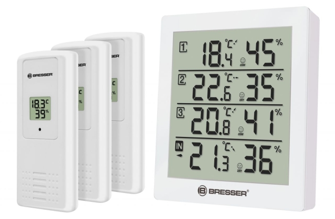 Bresser® Thermometer Hygrometer Temeo Hygro Quadro weiß Das Temeo Hygro Quadro Thermo- / Hygrometer bietet die Möglichkeit an 4 unterschiedlichen Messpunkten im und ums Haus Temperatur und Luftfeuchtigkeit zu messen.Dies ermöglicht die einfache Überwachung an einem Punkt: ist mein Kellerraum zu feucht Ist das Babyzimmer wohl temperiert? Ist es auf der Terrasse zu heiß?Und viele weitere frei wählbare Messmöglichkeiten.Die drei Fernsensoren liefern über 433 Mhz Funk die Daten an die Empfangsstation, gleichzeitig misst die Empfangsstation auch Temperatur und Luftfeuchtigkeit und liefert somit 4 Messergebnisse. Benötigt werden 3 x AAA / LR 03 Batterien (für die Haupteinheit) und 6 x AAA / LR 03 Batterien (für die Fernsensoren). EIGENSCHAFTEN: 4 Messergebnisse für Temperatur und relative Luftfeuchtigkeit 433 MHz Übertragungsfrequenz Fernsensoren sind spritzwassergeschützt, somit für den Außeneinsatz geeignet Thermo/Hygro-Fernsensor (3 x inkl.) zum Aufstellen oder Aufhängen Maße und Gewicht Basisstation: 10,4 x 11,9 x 2,5 cm, 152 g LIEFERUMFANG: Thermo- / Hygrometer 3 x Fernsensor Bedienungsanleitung