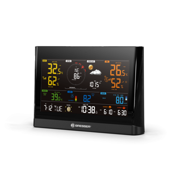 Schlichte Eleganz kombiniert mit ganz viel Farbe für den ultimativen Wetterüberblick: So fügt sich das BRESSER WLAN Comfort Wettercenter mit 7-in-1 Profi-Sensor auch in Ihr Zuhause perfekt ein. Ob Landhausstil oder Scandinavian Chic – per Wandmontage oder auf dem Standfuß finden Sie für das moderne Basisgerät ganz schnell den richtigen Platz. Und wo auch immer der ist: Die LCD-Display-Kontrasteinstellung sorgt garantiert dafür, dass Sie die Wetterlage auf dem großzügigen 5,7'-Farbdisplay aus nahezu jedem Betrachtungswinkel genau im Auge behalten. Die meisten Daten dafür kommen von dem Funksensor. Er füttert Ihr Wettercenter mit aktuellen Messwerten zu Außentemperatur, Luftfeuchtigkeit, Windgeschwindigkeit, Windrichtung, Niederschlagsmenge, UV-Level und Lichtintensität. Aber nicht nur das Wetter draußen, sondern auch das Klima im Raum trägt zu unserem Wohlbefinden bei. Darum misst die Konsole Innentemperatur, Luftfeuchtigkeit und Luftdruck und errechnet daraus den Komfortlevel – für ein meteorologisch rundes Bild.Kühler Kopf bei jedem Wetter – mit dem WLAN-WettercenterSie haben nach dem bestätigenden Blick aufs Thermometer beim Verlassen des Hauses doch schon mal gefroren? Deshalb errechnet Ihnen die WLAN-Wetterstation aus den relevanten Werten, Wind, Luftfeuchtigkeit und Temperatur die gefühlte Temperatur. Um die warmen Strahlen im Sommer unbekümmert zu genießen, reicht dagegen ein Blick auf die aktuelle Sonnenbrandzeit in Minuten. Denn die sagt Ihnen genau, wie lange Ihre Haut bei den aktuellen Verhältnissen ebenfalls noch Freude daran hat. Auch woher der Wind weht bzw. wie stark, zeigt Ihnen das Wetter-Center mit der Anzeige der aktuellen aus 16 Windrichtungen und dem Beaufort-Index. Und durch den Hoch-/Tiefwerte-Alarm lassen Sie sich ganz einfach auf relevante Veränderungen aufmerksam machen.Aktuelle Daten – die reichen Ihnen nicht? Dann schauen Sie in die Wetter-Zukunft und -Vergangenheit. Die grafische Wettertrend-Vorhersage verrät Ihnen schnell, was Sie in den kommenden 12 Stunden erwarten können. Der meteorologische Blick zurück gelingt mit dem Min.-/Max.-Wertespeicher, mit dem Sie auf die Daten bis zu 24 Stunden zugreifen. Praktisch für Pflanzenfreunde: die Anzeige der Niederschlagsmenge in verschiedenen Zeitintervallen. So planen Sie gezielt, wann der Rasensprenger oder Gartenschlauch wieder zum Einsatz kommt.Der smarte Umgang mit dem WetterFacebook, Instagram und Co. – in der heutigen Welt wird viel geteilt. Über die WLAN-Verbindung können Sie auch Ihre Wetterdaten auf speziellen Plattformen wie z. B. Weather Underground und Weather Cloud veröffentlichen. Greifen Sie dann darauf zu – auf Ihrem Smart-Device über die jeweilige App und von überall auf der Welt. Das deutschsprachige Portal AWEKAS bietet für Smart-Home-Besitzer ein zusätzliches Plus: Übertragen Sie die Messwerte des 7-in-1-Sensors zu Temperatur, Luftfeuchtigkeit etc. an Ihre Smart-Home-Steuerung. Auch weitere optionale Funksensoren wie Bodensensoren oder Poolthermometer (beide nicht enthalten) binden Sie in Ihr System ein. Einfach unter dem folgenden Link unseres Partners AWEKAS einrichten:https://www.awekas.at/for2/index.php?thread/17080-software-api-stations-api-beschreibung-beta/Alles andere als zeitlos – das WettercenterZur richtigen Zeit am richtigen Ort sein: Damit Ihnen das zuverlässig gelingt, finden Sie auf dem Display der Basisstation einen übersichtlichen Abschnitt mit Uhrzeit, Datum und Wochentag. Dabei ist die Zeitangabe durch die Internet-Zeitsynchronisation immer aktuell. Wer stets einen besonderen Blick auf den Mond hat, freut sich über die Anzeige der Mondphase. Sie sind eher der Sonnentyp? Dann schauen Sie auf die Zeiten für den Sonnenaufgang und den Sonnenuntergang und genießen Sie das faszinierende Farbenspiel am Himmel. Um für ersteres und auch generell rechtzeitig den Weg aus dem Bett zu finden, stellen Sie die Basiskonsole Ihres Wettercenters einfach auf Ihrem Nachttisch auf. Der integrierte Wecker holt Sie zuverlässig in den Tag. 5 extra Minuten waren bei der Weckzeit schon eingerechnet? Dann einfach auf die Schlummertaste drücken und noch mal weiterdösen. Und damit auch im Winter zeittechnisch alles glattläuft, weckt Sie der Eis-/Frostalarm 30 Minuten früher, wenn die Außentemperatur unter -3 °C liegt.Lokal und aktuell – profitieren Sie mit dem BRESSER WLAN Comfort Wettercenter mit 7-in-1-Außensensor von Ihren eigenen meteorologischen Messdaten.EIGENSCHAFTEN BASISSTATION5,7-Zoll-Farbdisplay für detaillierte Zeit- und WetterinformationenLC-Display-Kontrasteinstellung zur Anpassung an unterschiedliche BetrachtungswinkelWLAN-Verbindung zur Veröffentlichung der Daten auf Wetterplattformen wie z. B. AWEKAS, Weather Underground und Weather CloudInnentemperatur (°C/°F) und Luftfeuchtigkeit mit KomfortanzeigeAnzeige von Außentemperatur (°C/°F) und LuftfeuchtigkeitUV-Index mit UV-Level-IndikatorLichtintensitätsanzeigeAnzeige der Sonnenbrandzeit (Min.)Windgeschwindigkeitsanzeige (Böen oder Durchschnittsgeschwindigkeit)Beaufort-Index-Stufe (Skala zur Klassifizierung der Windgeschwindigkeit)Anzeige der Windrichtung (aktuell und vorherrschend anhand von 16 Richtungen)Anzeige der Niederschlagsmenge (stündlich, täglich, wöchentlich, monatlich, Gesamtregen)Wettervorhersage (sonnig, teils bewölkt, bewölkt, regnerisch, stürmisch, verschneit)LuftdruckanzeigeGefühlte AußentemperaturWetterindex für Taupunkt, Windchill-Faktor und HitzeindexMin.-/Max.-Wertespeicher (bis zu 24 Stunden)Hoch-/Tiefwerte-Alarm mit Blinksymbol auf dem DisplayWecker mit Eis-/FrostwarnungUhrzeit (Internet-Zeitsynchronisation), Datum, Wochentag und MondphaseSonnenauf- und –untergangWetterdatenkalibrierung3 verschiedene Display-Helligkeitsstufen: High / Low / Off7 Sprachen für Wochentag (EN/ DE/ FR/ ES/ IT/ NL/ RU)Unterstützung von Firmware-UpdatesSicherheitstyp: unterstützt WPA3-VerschlüsselungUnters
