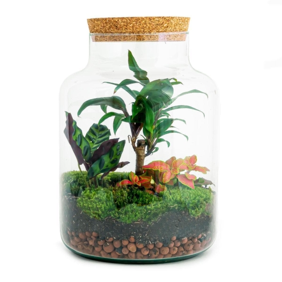 Produktbeschreibung:. Erleben Sie die Natur hautnah mit unserem DIY-Terrarium-Kit "Oase Milchpalme". Schaffen Sie sich mit dem einfachen Fünf-Schritte-Plan ein selbstständiges Mini-Ökosystem, das nicht nur eine Augenweide ist, sondern auch kaum Pflege bedarf. Die perfekte Mischung aus Mini-Palme, Calathea und Fittonia schafft ein grünes Paradies im Glas. Die Kombination aus Hydrokorrels, Aktivkohle und spezieller Terrarium-Potgrond bietet die ideale Grundlage für gesundes Pflanzenwachstum, während die dekorativen Steine und das frische Bolmoos dem Ensemble den letzten Schliff verleihen.. Produkthighlights:. Kompaktes Design mit einer Höhe von 30 cm, passend für jede Inneneinrichtung. Selbstpflegende Pflanzen, die perfekt für Pflanzenliebhaber ohne grünen Daumen sind. Stilvolles Terrarium mit Korkdeckel, das als Blickfang dient. Enthält alles, was Sie brauchen, um sofort mit der Gestaltung zu beginnen. Ideal für:. Pflanzenliebhaber, die wenig Zeit haben, sich aber dennoch an der Schönheit und Ruhe eines persönlichen Gartens erfreuen möchten.. Pflegehinweis:. Gießen Sie sparsam und nur, wenn das Substrat trocken erscheint. Platzieren Sie Ihr Terrarium an einem Ort mit indirektem Licht und vermeiden Sie direkte Sonneneinstrahlung.. Was ist im Produkt enthalten?. Terrariumglas mit Korkdeckel, 30 cm Höhe. Pflanzenauswahl: Mini-Palme, Calathea, Fittonia. Hydrokorrels und Aktivkohle für die Wasseraufbereitung. Terrarienerde für optimale Pflanzbedingungen. Dekorative Steine und frisches Bolmoos. Detailliertes Schritt-für-Schritt-Anleitungsheft und Pflegetipps. Standort: Hell und warm, aber ohne direkte Sonneneinstrahlung, idealerweise in einem Büro oder Wohnbereich.. Pflegeaufwand: Niedrig - das Ökosystem pflegt sich nach der Einrichtung größtenteils selbst.. Raumklima: Bevorzugt Raumtemperatur und mittlere Luftfeuchtigkeit.. Lichtverhältnisse: Helle, indirekte Beleuchtung fördert das Wachstum ohne die Pflanzen zu schädigen.