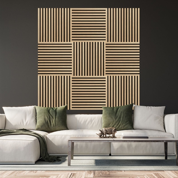 Akustikpaneele SQUARE Individuelle Akzente setzen Die Akustikpaneele SQUARE bringen ein natürliches Flair in den Innenbereich. Sie strahlen Wärme aus und geben Wohnräumen das Plus an Behaglichkeit. Die SQUARE-Paneele bieten die Möglichkeit, individuelle Designideen umzusetzen. Sie können die quadratischen Paneele in verschiedenen Mustern anordnen. Oder mischen Sie verschiedene Farben – lassen Sie Ihrer Kreativität freien Lauf!Gut, wenn zudem die Geräuschkulisse im angenehmen Pegel gehalten werden kann. Die Akustikpaneele bieten eine einfache und effektive Möglichkeit, den Schall in Innenräumen zu reduzieren. Neben weiteren Faktoren ist die Wirksamkeit von der beplankten Fläche abhängig.Besonders gut, wenn dieser Wohnkomfort mit Nachhaltigkeit einhergeht: Das FSC® 100 % Zertifikat gibt Ihnen die Sicherheit, dass es sich bei den Akustik-Paneelen um umweltfreundliche Produkte handelt. Das Holz stammt aus verantwortungsvoll bewirtschafteten Wäldern.Das Anbringen der Paneele ist dank der Trägerplatte denkbar einfach. Kein Fachwissen ist erforderlich, um die Paneele schnell und sicher zu montieren. Ohne großen Aufwand lassen sich im Handumdrehen beeindruckende optische Ergebnisse erzielen.Produktinfos Schallabsorbierendes Wandpaneel bestehend aus Polyester, MDF und hochwertigem Echtholzfurnier Für Wände und Decken geeignet Lamellenabstand: 15 mm Farbe: Ash Nicht für die Verwendung in Nassräumen geeignet FSC® 100% zertifiziert Maße: 52 cm x 52 cm x 2,2 cm (Länge x Breite x Stärke)