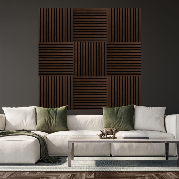 Akustikpaneele SQUARE Individuelle Akzente setzen Die Akustikpaneele SQUARE bringen ein natürliches Flair in den Innenbereich. Sie strahlen Wärme aus und geben Wohnräumen das Plus an Behaglichkeit. Die SQUARE-Paneele bieten die Möglichkeit, individuelle Designideen umzusetzen. Sie können die quadratischen Paneele in verschiedenen Mustern anordnen. Oder mischen Sie verschiedene Farben – lassen Sie Ihrer Kreativität freien Lauf!Gut, wenn zudem die Geräuschkulisse im angenehmen Pegel gehalten werden kann. Die Akustikpaneele bieten eine einfache und effektive Möglichkeit, den Schall in Innenräumen zu reduzieren. Neben weiteren Faktoren ist die Wirksamkeit von der beplankten Fläche abhängig.Besonders gut, wenn dieser Wohnkomfort mit Nachhaltigkeit einhergeht: Das FSC® 100 % Zertifikat gibt Ihnen die Sicherheit, dass es sich bei den Akustik-Paneelen um umweltfreundliche Produkte handelt. Das Holz stammt aus verantwortungsvoll bewirtschafteten Wäldern.Das Anbringen der Paneele ist dank der Trägerplatte denkbar einfach. Kein Fachwissen ist erforderlich, um die Paneele schnell und sicher zu montieren. Ohne großen Aufwand lassen sich im Handumdrehen beeindruckende optische Ergebnisse erzielen.Produktinfos Schallabsorbierendes Wandpaneel bestehend aus Polyester, MDF und hochwertigem Echtholzfurnier Für Wände und Decken geeignet Lamellenabstand: 15 mm Farbe: Smoked Oak Nicht für die Verwendung in Nassräumen geeignet FSC® 100% zertifiziert Maße: 52 cm x 52 cm x 2,2 cm (Länge x Breite x Stärke) Tags: Dekowand Holzwand Wandtapete Paneel Panel Schallschutzpaneel FSC® 100 % Akustikplatten Wandpaneel Wand Deko Wand Holz Tapete Wandplatten Schallschutzpaneel Akustik Lammelenwand Lamellen Wohnzimmer