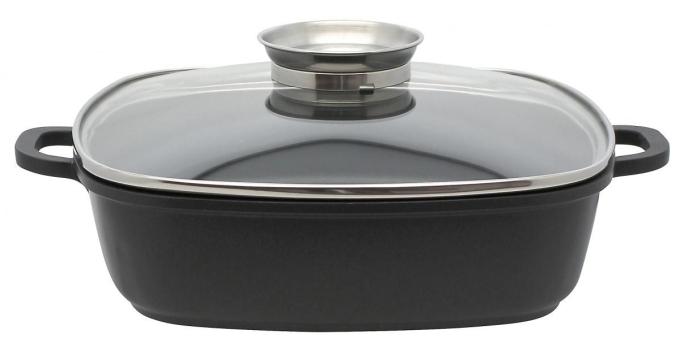ELO Aluguss Servierpfanne eckig  28 cmAluguss findet aufgrund seiner positiven Eigenschaften immer mehr Liebhaber. Das Material hält sehr gut die Wärme. Aufgrund der  mit ILAG® Basic - Antihaftversiegelung ist die Servierpfanne sehr leicht zu reinigen, da nichts haften bleibt. Sie können die Servierpfanne  auf allen Herdarten verwenden, denn sie ist  auch  induktionsfähig. Quadratische Servierpfanne mit Glasdeckel und Aromaknopf  zum einfachen Einfüllen von Flüssigkeiten Ø 28 x 28 cm,  Volumen 3,6 LiterDie Servierpfanne ist ohne Deckel bis 240°C backofenfest (mit Glasdeckel bis 180 °C)