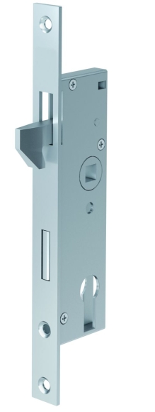 ES 988 - Einsteckschloss mit Hakenfalle für Schiebetüren. Das Hakenfallenschloss zeichnet sich durch eine simple und einfache Montage mit 2 Schrauben aus. Zur Verwendung bei Profilrahmen-Schiebetüren mit Wechsel. Riegel 1-tourigHakenfallenriegelschloss mit ProfilzylinderlochungFür Profilrahmen Schiebetüren mit WechselDornmaß wahlweise 35 mm / 40 mm, Entfernung: 72 mm, Vierkant: 8 mm, Riegel: 1-tourigRiegel und Hakenfalle aus StahlStulp: Nickel-Silber lackiert