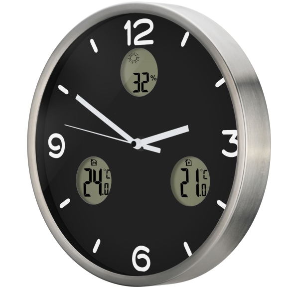 Die BRESSER MyTime io NX Wanduhr zeigt neben der DCF Funkübertragenen-Uhrzeit auch die Innentemperatur, Außentemperatur, sowie die relative Luftfeuchtigkeit und Wettertrendvorhersage an. Der Funkaußensender ermöglicht bis zu einer Reichweite von 30 m (im Freien) die Übertragung der Außentemperatur. Die Einstellung der Uhrzeit sowie die Umstellung auf Sommer- bzw. Winterzeit erfolgt automatisch über das DCF Zeitsignal. Darüber hinaus haben Sie mit der Wetter-Wanduhr auch die Temperatur und Luftfeuchtigkeit - jeweils dauerhaft angezeigt. Dank des geräuscharmen Funkuhrwerks mit schleichendem Sekundenzeiger macht die Uhr keine nervigen Tick-Tack-Geräusche. Die Uhr ist für den Gebrauch im Außenbereich und in Nassräumen nicht geeignet!EIGENSCHAFTEN30cm große Wanduhr für den InnenbereichFunkuhr (selbsteinstellend; automatische Einstellung der Sommerzeit)kein nervendes Tick-Tackgebürsteter EdelstahlrahmenInnen- und AußentemperaturanzeigeRelative Innenraum-Luftfeuchtigkeit in %LIEFERUMFANG1x Wetter-Wanduhr (3x AA Batterien benötigt, nicht im Lieferumfang enthalten)1x Außensensor (2x AAA Batterien benötigt, nicht im Lieferumfang enthalten)