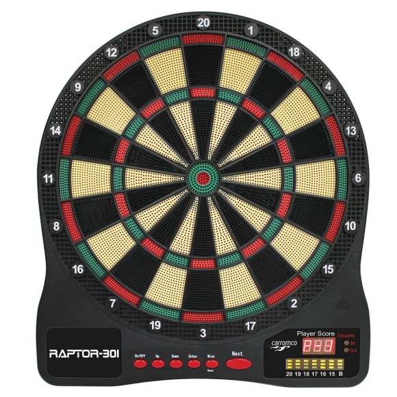 Das CARROMCO ELEKTRONIK DARTBOARD RAPTOR-301 ist ein elektronisches Dartboard mit 4-Loch Abstand. * Für 1-8 Spieler * 2 LED Displays (inklusive 1 Cricket-Display) * 32 Spiele mit 570 Variationen (inkl. Cricket) * Einfache Bedienung über 6 Tasten * 4-Loch Abstand (Double und Triple Felder) * Double IN/ Double OUT/ Double IN/OUT * Cyber Option: allein gegen den Computer Zubehör: * 6 Softdarts, extra Tips * Batteriebetrieb, (3AA Batterien nicht enthalten) Maße: 44,4 x 39,5 x 2,2 cm Gewicht: 0,864 kg. ARTIKEL NUR FÜR DEN PRIVATEN HAUSHALT – NICHT FÜR EINRICHTUNGEN ETC. GEEIGNET!