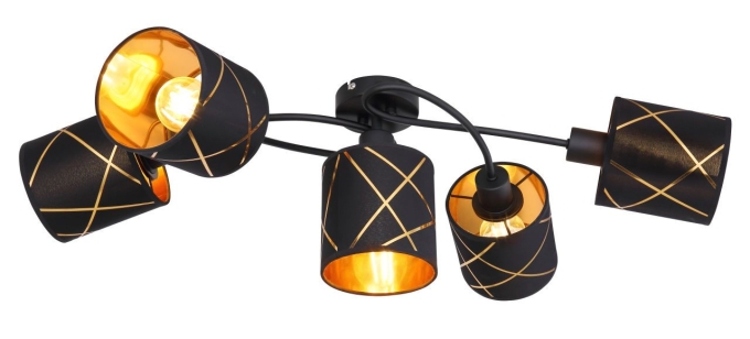 Deckenleuchte Metall schwarz matt, Textil schwarz, Acryl goldfarben, LxBxH: 790x400x227mm, exkl. 5x E27 25W 230V