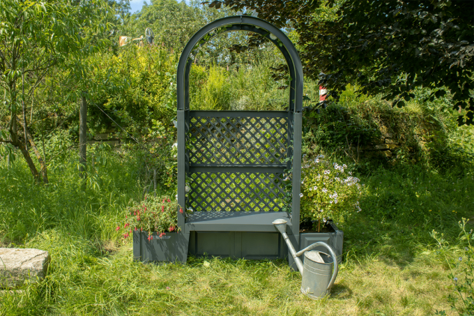 Stabile Gartenbank mit 2 Pflanzkästenund Spalier + Rosenbogen.Abmessungen aufgebaut: B 174 x T 49 x H207 cm.Diese gemütliche und stabile Gartenbankaus Kunststoff lädt geradezu zum Verweilen ein - tagsüber mal eine kleine Pausewährend der Gartenarbeit oder abends mit einem Gläschen Wein. An jeder Seiteder Bank ist ein Pflanzkübel angebracht, in dem auch noch Ihre Lieblingsblumeneinen schönen und dekorativen Platz bekommen.