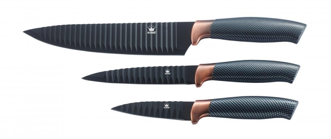3tlg. Messerset KING® CARBON DESIGN Edelstahl beschichtete Klingen mit Riffelstruktur / Größen: Kochmesser 20cm, Universalmesser 12.5cm,  Gemüsemesser 8.5cmDas KING® Messerset im CARBON DESIGN ist der absolute Blickfang in Ihrer Küche.Die schwarzen Messerklingen sind Edelstahl beschichtet. Die Riffelstruktur und Beschichtung der Messerklingen sorgen dafür, dass beim Schneiden an den Klingen nichts haften bleibt.Praktisch bei der alltäglichen Nutzung.Mit dem KING Messerset ist ein hygienisch sauberes Arbeiten in der Küche möglich.Die Messergriffe sind angenehm anzufassen - die Messer liegen leicht in der Hand.1x Kochmesser 20cm, 1x Universalmesser 12.5cm,  1x Gemüsemesser 8.5cmansprechende Carbon-Optik3 Messer in GeschenkkartonKlappkarton mit Magnetverschluss