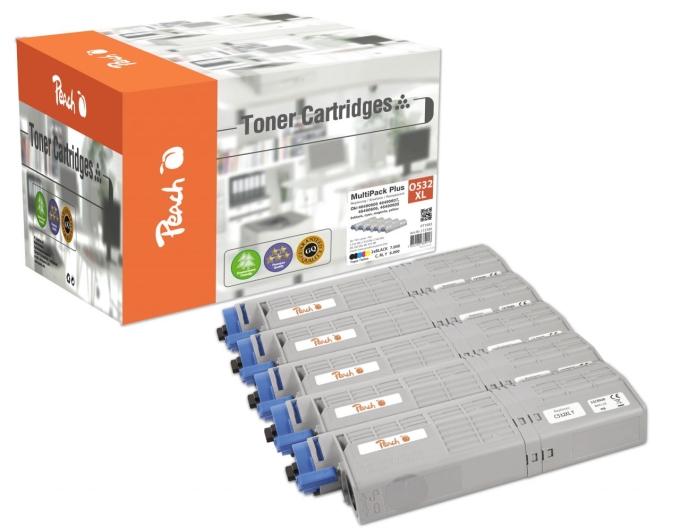 Peach Spar Packs - Sparen Sie zusätzlich gegenüber dem Einzelkauf!5 Tonermodule.1.00 x Peach Tonermodul magenta kompatibel zu OKI 464906061.00 x Peach Tonermodul gelb kompatibel zu OKI 464906051.00 x Peach Tonermodul cyan kompatibel zu OKI 464906072.00 x Peach Tonermodul schwarz kompatibel zu OKI 46490608Tonermodule von Peach garantieren langfristig einwandfreie Ausdrucke ohne Qualitätsverlust. Es handelt sich um wiederaufbereitete Produkte, wobei alle Verschleissteile vollständig ausgetauscht werden. Qualität die Sie spüren!