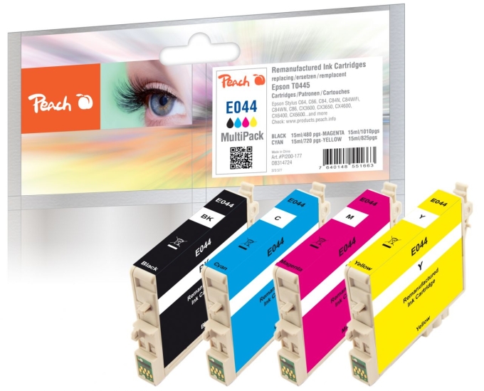 Peach Spar Packs - Sparen Sie zusätzlich gegenüber dem Einzelkauf!4 Tintenpatronen.1.00 x Peach Tintenpatrone gelb kompatibel zu Epson T0444Y, C13T044440101.00 x Peach Tintenpatrone schwarz kompatibel zu Epson T0441BK, C13T044140101.00 x Peach Tintenpatrone cyan kompatibel zu Epson T0442C, C13T044240101.00 x Peach Tintenpatrone magenta kompatibel zu Epson T0443M, C13T04434010Peach ist eine führende Schweizer Marke für kompatible Tintenpatronen. Spitzentechnologie gewährleistet höchste Qualität und führt zu herrvoragenden Ergebnissen. Farb- und Lichtechtheit entsprechen höchsten Anforderungen und gewährleisten brillante Druckresultate. Um die Premium Qualität sicherzustellen, wird die Tinte im eigenen Entwicklungszentrum in der Schweiz entwickelt und anschliessend in unseren Fertigungsstandorten in die Tintenpatronen abgefüllt. Produktion und Fertigung entsprechen neusten Erkenntnissen aus Lehre und Forschung. Qualität, mit der asiatische Hersteller nicht gleichziehen können und dies zu immer noch sehr attraktiven Preisen. Eine echte Alternative zu teuren Original Produkten oder Billigsttinten.