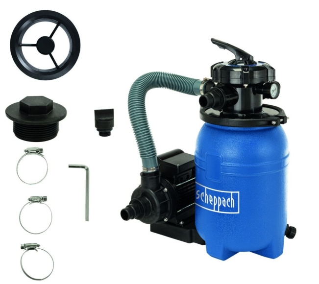 Scheppach Poolsandfilteranlage PSFA15 inkl. Zubehör Mehrwegeventil mit fünf Funktionen: filtern, entleeren, geschlossen, rückspülen, nachspülen Stabiler Filterbehälter mit 254 mm Durchmesser,   Quarzsand (Ø 0,45  ̶  0,55 mm) fungiert als Filtermedium 250 Watt starke selbstansaugende Pumpe, montiert auf stabiler Grundplatte Anschlussgröße 1,5″ Filterleistung 5900 L/h bei 225 Watt / 220  ̶  240 V~ Geeignet für Wassertemperaturen von 4 °C bis 43 °C 5.800 l/h PumpenleistungLieferumfang Mehrwegeventil Verriegelungsflansch Manometer Filterbehälter Schwimmbadpumpe Grundplatte Anschlussset