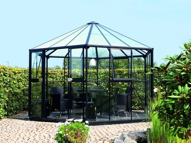 Nicht nur Ihre Pflanzen werden das Hera lieben: Der Pavillon besticht durch seine elegante Erscheinung, die ihn zu einem Schmuckstück unter den Gewächshäusern macht.Der formvollendete Aluminiumpavillon Hera 9000 ist inkl. Stahlfundamentrahmen, drei Seitenfenstern, Zwangsentlüftung im Dach und komfortabler Doppelschiebetür in einer Breite von 80 cm und einer Höhe von 177 cm erhältlich. Zur Auswahl stehen drei Farben: Aluminium eloxiert, Smaragd oder Schwarz (pulverbeschichtet). Die Seiten werden mit Abdeckleisten aus PVC befestigt. Das Dach ist mit ca. 6 mm starken, UV-stabilisierten Hohlkammerplatten (HKP) eingedeckt. Dies schützt die Pflanzen gegen zu starke Sonneneinstrahlung und sorgt für eine ausgeglichene Temperatur. Die Seitenwände sind mit Einscheibensicherheitsglas (ESG) ca. 3 mm verglast. Das Hera 9000 ist serienmäßig mit einer Regenrinne und zwei Regenfallrohren ausgestattet. Das Höhenmaß ist inkl. Fundamentrahmen gemessen.