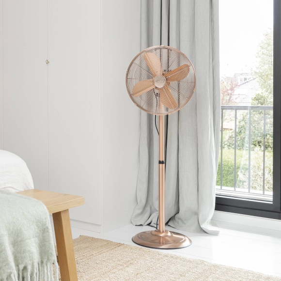 Kupferfarben glänzender Stand-Ventilator VE5971 - in der Höhe verstellbar Passend zum angesagten Retro-Stil gibt es jetzt den Stand-Ventilator VE5971 mit integriertem Tragegriff, so kann der Stand-Ventilator VE5971 jeweils in den Raum gebracht werden, dessen Luft abgekühlt werden soll. Funktionen Der Stand-Ventilator lässt sich komfortabel in der Höhe bis auf max. 128 cm verstellen. Für die gewünschten Klimaverhältnisse im Raum kann zwischen drei Geschwindigkeiten gewählt werden. Mit Oszillationsfunktion (85°) ausgestattet. Der Kopf ist um 20 Grad schwenkbar. Ein Überhitzungsschutz ist eingebaut. Technische Daten Leistung: 50 Watt Geschwindigkeit: 950/1.100/1.250 /min Luftstrom: 3.560 m³/Stunde Geräuschentwicklung: 64,3 dB