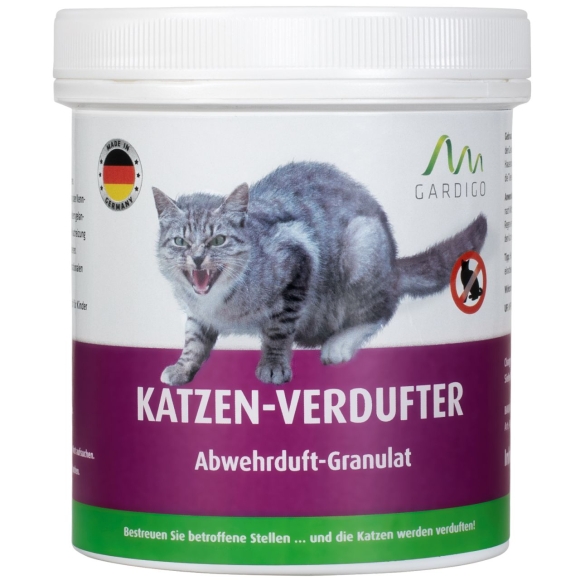 Katzen-Verdufter Katzen haben empfindliche Nasen. Das Katzen-Verdufter-Granulat von Gardigo enthält einen Duftstoff, der ungebetene Samtpfoten fernhält. Diese verabscheuen den Geruch und meiden die Bereiche, die Sie damit behandeln, wie zum Beispiel Beete, Zäune, Terrassen und Hausecken. Anwendung: Breitwürfig auf die zu schützende Fläche streuen. 20 - 40 g reichen je nach Witterung gut 1 m². Hat sich der Geruch nach 7 - 10 Tagen oder nach heftigem Regen verflüchtigt, Einsatz wiederholen. So lange einsetzen, bis die zu vertreibenden Katzen nicht mehr wiederkommen. Tipp: Haben sich die natürlichen Duftöle verflüchtigt, Granulat in den Boden einarbeiten: Es verbessert das Wasserhaltevermögen. Wirkstoff: 20 g/kg Geraniol CAS Nr. 106-24-1, Biozid PT 19 UFI: WPEJ-4U2N-R4CA-TYEV BAUA-Nr. N-84732 Inhalt: 300 g Achtung! Biozide sicher Verwenden. Vor Gebrauch stets Kennzeichnung und Produktinformation lesen. Gefahrenhinweise: Kann allergische Hautreaktionen verursachen. Sicherheitshinweise: Ist ärztlicher Rat erforderlich, Verpackung oder Kennzeichnungsetikett bereithalten. Darf nicht in die Hände von Kindern gelangen. Schutzkleidung/Augenschutz/Gesichtsschutz tragen. Bei Hautreizung oder -ausschlag: Ärztlichen Rat einholen/ärztliche Hilfe hinzuziehen. Entsorgung: gemäß den örtlichen/regionalen/nationalen/internationalen Vorschriften. Lagerung und Transport: Getrennt von Lebens- und Futtermitteln, unzugänglich für Kinder und nur in der verschlossenen Originalpackung aufbewahren. LGK nach VCI: 11
