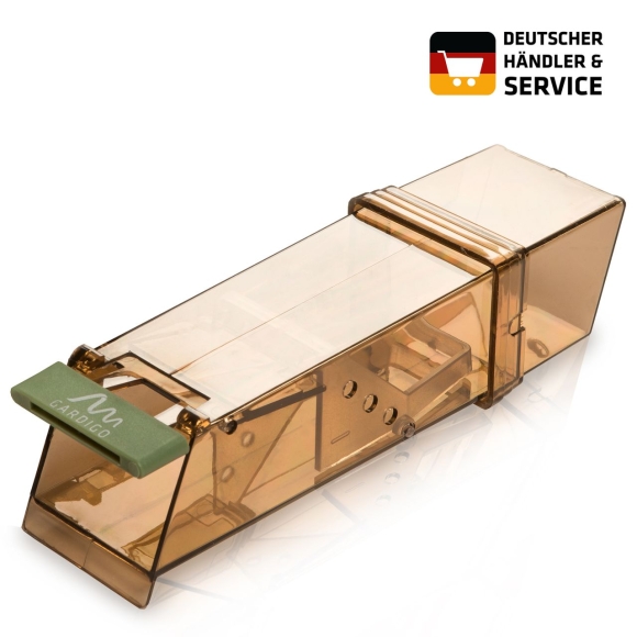 Leicht zu reinigende Lebendfalle aus abwaschbarem Kunststoff. Mäuse im Haushalt sind unangenehm und können schnell zu Beeinträchtigung der Gesundheit führen, wenn die Nager sich über Lebensmittel hermachen oder man mit Mäusedreck in Kontakt kommt. Das Beseitigen von Mäusen aus der eigenen Umgebung ist wichtig, um größere, negative Folgen ausschließen zu können.Was allerdings nicht vonnöten ist, ist das Töten der Mäuse im Haus. Die Nager können ebenfalls zuverlässig lebend gefangen und schließlich wieder in der Natur ausgesetzt werden. Die Maus-Lebendfalle von Gardigo ist speziell für diesen Zweck bestimmt.Die Maus wird über einen Mechanismus lebend gefangen und kann aus ihrer Falle nicht mehr entkommen. Läuft die Maus zum Köder hin, drückt sie den Rahmen zu Boden und die dadurch gehaltene Tür fällt zu. Die Falle bleibt unversehrt und ist somit wiederverwendbar. Das transparente Gehäuse macht den Fangerfolg schnell sichtbar und eine regelmäßige Fallen-Kontrolle einfach. Eine humane Mäusebekämpfung! Hinweis: Die Falle muss mehrmals täglich auf Fang kontrolliert werden.Einfach, lebend, schmerzfrei – Die Maus-Lebendfalle von Gardigo