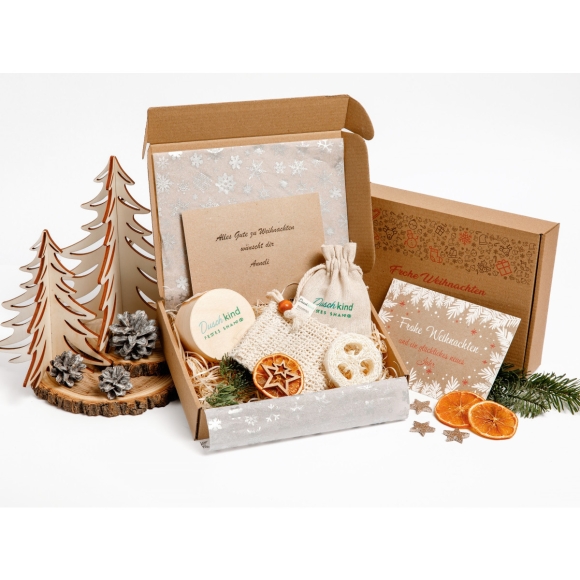Geburtstagsgeschenk Freundin - Wintertraum: Dieses Kosmetikgeschenkset bietet nicht nur im Winter wohltuende Entspannung bei der Körperpflege! Du erhältst ein natürlich duftendes Duschkind Blutorange mit der 4in1 Formel, 56 Gramm im Säckchen. Außerdem bekommst du einen cremigen festen Conditioner für normales Haar, 70 Gramm in einer Holzdose. Die Spülung fühlt sich sanft an und verströmt einen angenehmen Duft. Mit im Paket befindet sich ein Sisalsäckchen und eine Loofahscheibe.
