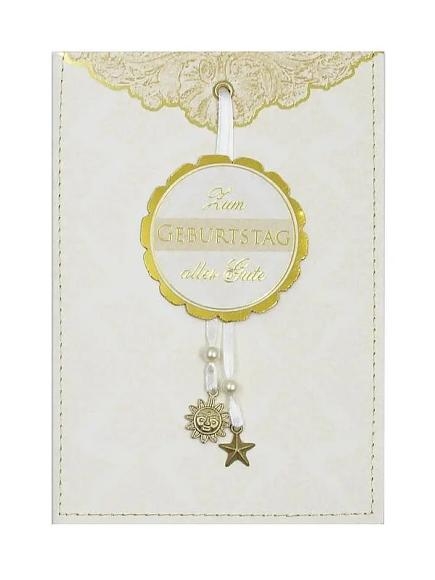 Schlichte Geburtstagskarte für persönliche Geburtstagsgrüße  Legen Sie diese schöne Klappkarte zum Geburtstagsgeschenk dazu. Als Besonderheit hat die Geburtstagskarte zwei kleine goldfarbene, sonnen- und sternenförmige Anhänger. Der Text lautet: "Zum Geburtstag alles Gute", Text innen: "Viel Glück, Sonnenschein und gute Laune!" Zur Geburtstagskarte gehört ein weißer Briefumschlag.  Geburtstagskarten aus unserem Geschenkeshop Über Einladungskarten, Geburtstagskarten und Grußkarten freut sich jeder, auch wenn sie ein bisschen aus der Mode gekommen zu sein scheinen. Es sind "handfeste" Gratulationen, Danksagungen oder Einladungen. Denn im Vergleich zu Grußkarten, die elektronisch versendet werden, kann man "echte" Geburtstagskarten zu Hause oder im Büro aufstellen und hat sie so immer vor Augen. Wir bieten Ihnen Geburtstagskarten für jeden Geschmack. Denn ein ansprechendes Design spielt bei den persönlichen Grüßen immer eine Rolle. Es ist wie bei einer Hochzeitskarte ganz wichtig, dass die "Aufmachung" zum festlichen Anlass passt. Einladungskarten werden häufig in einer größeren Stückzahl benötigt. Wer hat schon Zeit und Geschick genug, diese selbst zu basteln? Kaufen Sie Einladungskarten und Grußkarten deshalb bei uns im Geschenkeshop und legen Sie die eine oder andere Geburtstagskarte mit in den Warenkorb. Das Geschenk und die Grußkarten zusammen sparen Porto und Aufwand. Da Sie Geburtstagskarten immer selbst beschriften, wirken Sie beim Empfänger letztendlich doch persönlich und individuell. Bunt und fröhlich dürfen die Geburtstagskarten mit Ihren Grüßen wirken, edel und seriös sehen die Hochzeitskarten aus. Für offizielle und private Gelegenheiten finden Sie garantiert die richtige Grußkarte.  Dankeskarten sind zum Beispiel auch eine sehr schöne Möglichkeit, mit jemandem eine Beziehung zu pflegen. Egal, ob diese Grußkarte als Dank für die Geschenke nach einem Fest versendet wird, oder ob die Dankeskarte jemanden zwischendurch erreicht, dem man einfach einmal von ganzem Herzen "Danke" sagen möchte. So haben Geburtstagskarten und Dankeskarten je Ihre ganz eigene Bedeutung. Unsere Geburtstagskarten sind im Gegensatz zu den Geburtstagskarten, die in so manchem Ladengeschäft erhältlich sind, weder altmodisch noch kitschig und da es sich um Klappkarten handelt, haben Sie genügend Platz für persönliche Zeilen. Auch ein Foto oder ein Geldschein findet in den Geburtstagskarten Platz. Es gehört ein weißer Briefumschlag zu jeder Karte dazu.