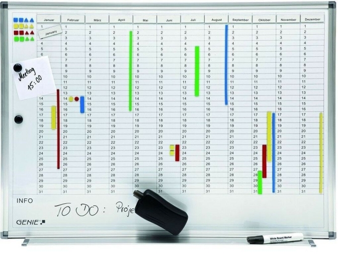 Der GENIE AP2000 Jahresplaner ist eine großformatige Magnettafel mit einem Aluminiumrahmen. Sie eignet sich ideal zur Darstellung von Betriebsabläufen, Geburtstagen oder Urlaubsplanungen. Dank der integrierten Aufhängevorrichtung lässt sich die Tafel problemlos an der Wand befestigen. Die Beschriftung der Tafel ist einfach und schnell erledigt und auch das Reinigen der Tafel ist kinderleicht.Die wichtigsten Merkmale des GENIE AP2000 Jahresplaners im Überblick:AluminiumrahmenEinfache Beschriftung und ReinigungIntegrierte AufhängevorrichtungMaße: 56 cm x 77 cmGewicht: 4 kgIm Lieferumfang enthalten sind zudem:24 Magnete für die Darstellung von 12 Monaten auf Deutsch und EnglischMagnete in 4 verschiedenen Farben zum Markieren von Terminen und Zeitspannen (insgesamt 220 Magnete)2 Haltemagnete2 schwarze Marker1 Reinigungsschwämmchen mit integriertem Halter für den MarkerMit dem GENIE AP2000 Jahresplaner haben Sie einen praktischen und vielseitigen Helfer für die Organisation und Planung Ihres Unternehmens oder Ihrer Familie.