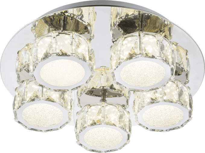 Diese edle und elegante runde Deckenlampe (Ø40cm) zeichnet sich durch Materialien und Design aus. Die fünf zum Teil in verchromten Metall eingefassten satinierten Acrylspots, mit klaren funkelnden K5 Kristallen besetzt, sorgen mit der passenden spiegelnden Deckenplatte für ein aufregendes Licht. Das inkludierte dimmbare 40W LED leistet maximal 2800 Lumen starkes Licht bei einer neutralweißen 4000K Lichtfarbe. Durch die Dimmfunktion schaffen Sie eine je nach Anlass gemütliche Wohnatmosphäre. Durch weitere Modelle dieser Serie können Sie das Bild Ihres Wohnraumes weiter verschönern.