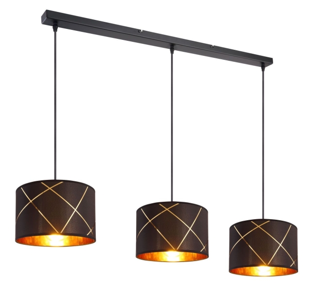 Glamour pur verkörpert diese schwarze Metallhängeleuchte der Serie BEMMO. Die dreiflammige Hängeleuchte verfügt über drei Lampenschirme mit Dekorstanzung. Das Licht dieser wunderschönen Hängelampe reflektiert durch das an der Innenseite des Lampenschirms angebrachte goldfarbige Acryl wunderbar. Diese Innenleuchte baumelt ca 140cm in den Raum. Durch das E27 Gewinde wird Ihnen bei der Leuchtmittelwahl bezüglich Lichtstärke und -farbe freie Wahl gelassen (excl. 3xE27, 40 Watt). Aufgrund ihrer Langlebigkeit bzw. Stromersparnis empfehlen wir LED Leuchtmittel. Diese traditionelle Leuchte ist besonders für Schlaf-, Wohn- und Esszimmer geeignet. Weitere Modelle dieser Serie komplettieren Ihren Wohnraum.