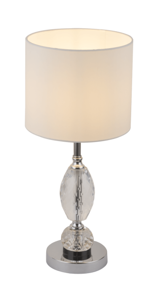 Die auffällig elegante und edle 34cm große Tischlampe dieser Modellserie punktet mit zeitlosem Design und tollen Materialien. Der weiße runde Textilschirm (Ø15cm), befestigt auf einem tollen Fuß aus verchromten Metall und klarem Kristall ist der Klassiker unter den Tischleuchten. Während diese Innenlampe über einen Ein/Aus Schaler verfügt, ermöglich Ihnen die verfügbare E14 Fassung das Leuchtmittel und damit die Lichtstärke und Lichtfarbe selber zu bestimmen (max.40W). Aufgrund ihrer Stromersparnis und Langlebigkeit empfehlen wir LED-Lampen.
