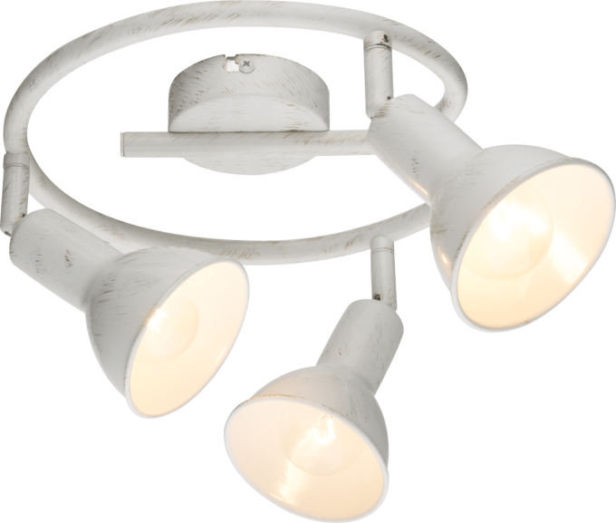Dieser Deckenstrahler aus der Modellserie Caldera verbindet Tradition und Design.Auf einem Arm in e-Form sind drei weiß gold patinierte bewegliche Metallstrahler mit weiß/goldener Schirminnenfarbe angebracht. Diese sind mit je einer E14 Fassung ausgestattet und bieten Ihnen die Möglichkeit das Leuchtmittel und somit auch die Lichtstärke und Lichtfarbe selber zu bestimmen (max. 40W). Aufgrund ihrer Stromersparnis und Langlebigkeit empfehlen wir LED-Lampen. Mit weiteren Lampen der gleichen Modellreihe können Sie das Bild in Ihrem Wohnbereich komplettieren.