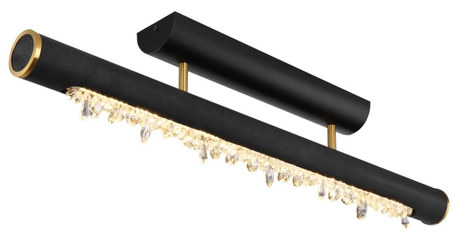 Deckenleuchte Metall schwarz matt, Holz schwarz, Acrylkristalle klar, Messingring matt, Memoryfunktion, burned wood, 3 Stufen über Wandschalter 100-40-10%, LxBxH: 800x75x190mm, inkl. LED 15W 230V, 1200lm Source, 680lm Output, 3000K