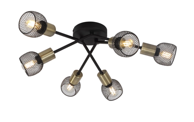 Diese Deckenlampe aus der Fiastra-Serie (ø 60 cm) überzeugt durch Ihr elegantes Design aus schwarz-mattem Metall und Altmessing. Die sechs Metallgitterschirme können mit je einem E14-Leuchtmittel Ihrer Wahl bestückt werden. Dadurch haben Sie die Möglichkeit, Lichtfarbe und Helligkeit nach Belieben zu bestimmen und für ein stilvolles Ambiente in Ihren Innenräumen sorgen.