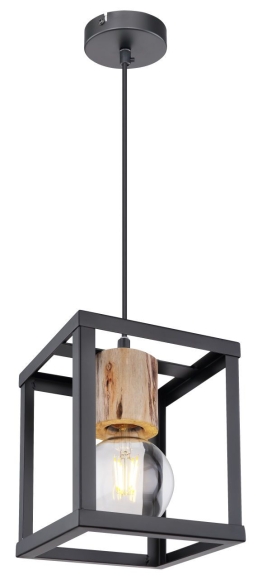 Hängeleuchte Metall schwarz matt, Holz naturfarben, Metall schwarz matt, Dekorhülse aus Holz über Fassung, LxBxH: 170x170x1200mm, exkl. 1x E27 60W 230V