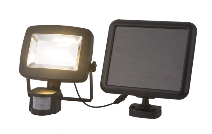 Hierbei handelt es sich um eine schwarze Kunststoff Solarleuchte mit praktischer Ausstattung. Wenn man mit der Leuchte den Außenbereich beleuchten möchte, dann braucht man keinen extra Stromanschluss, denn die Lampe verfügt über ein extra Solarpanel. Sie besitzt eine Zuleitung zum Strahler mit einer Länge von 470 cm. Damit die Leuchte ideal für den Außenbereich einbsetzbar ist, besitz sie die Schutzklasse IP 44. Ebenso ist ein Sensor mit Bewegungsmelder der 3 - 5 m in einem 180 ° Winkel reicht integriert sowie ein Schalter. Die Lichtleistung der Solarleuchte beträgt 500 Lumen und gibt eine angenehme warmweiße Lichtfarbe von 3000 K wieder.