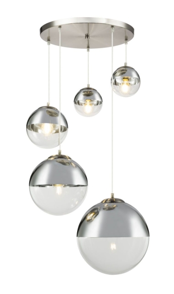 Diese moderne Hängeleuchte, aus der Serie Varus, überzeugt mit ihrer wunderschönen Optik. Der Durchmesser des runden Deckenelements beträgt 65cm, daran befinden sich fünf verschieden große Glaskugeln. Im oberen Teil ist die Glaskugel nickelmatt. Durch ihr Design wird sie garantiert zu einem Blickfang in jedem Wohnzimmer oder Schlafzimmer. Dank fünfE27-Fassungen, haben Sie die Möglichkeit das Leuchtmittel bis max. 40 Watt zu bestimmen. Je nachdem welche Lichtfarbe und Lichtstärke Sie gerne hätten. Wir empfehlen Ihnen LED-Lampen, wegen ihrer Langlebigkeit und Stromersparnis. Sie können die Pendelleuchte sehr gut mit anderen Artikel dieser Serie kombinieren.